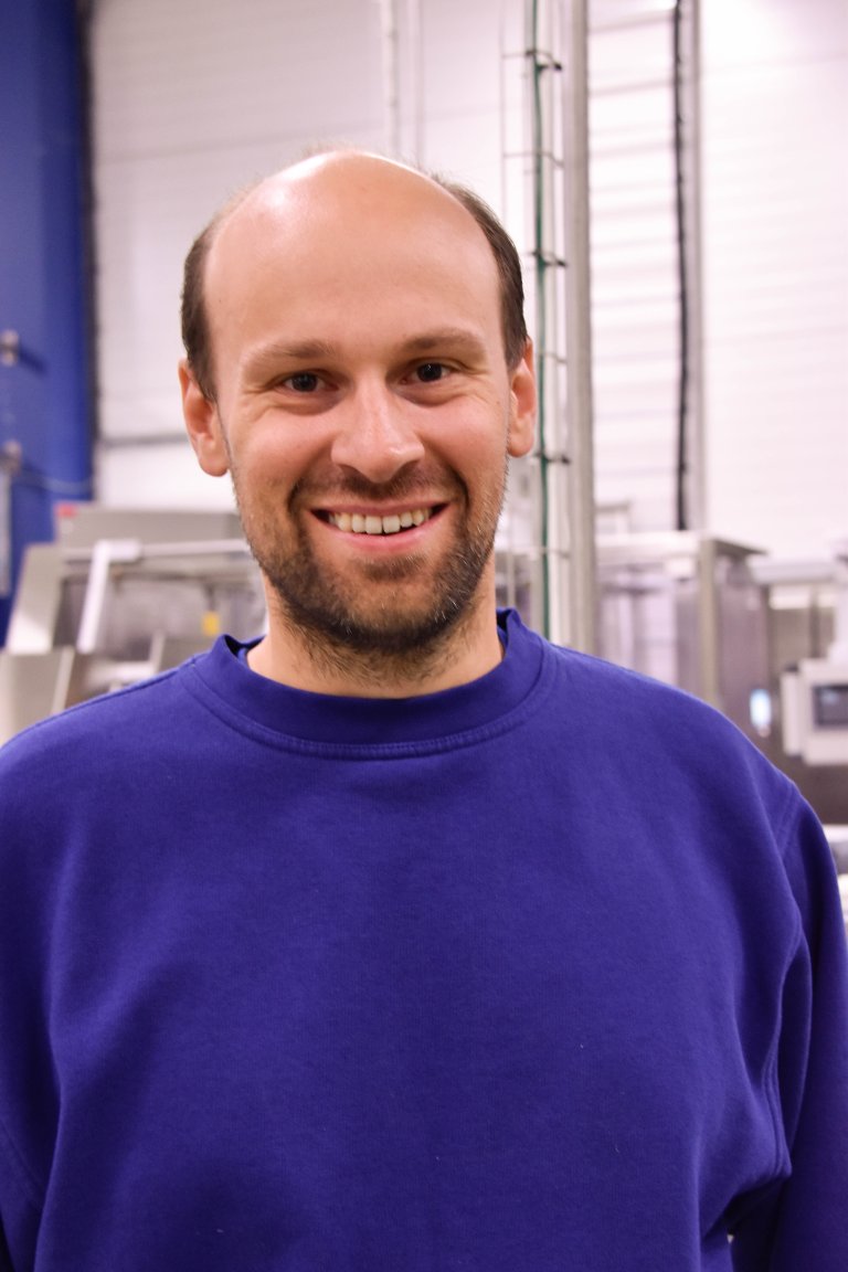 Også han er tydelig fascinert av de nye maskinene og hele produksjonslinjen, selv om det er en del ekstra å gjøre med nye maskiner.